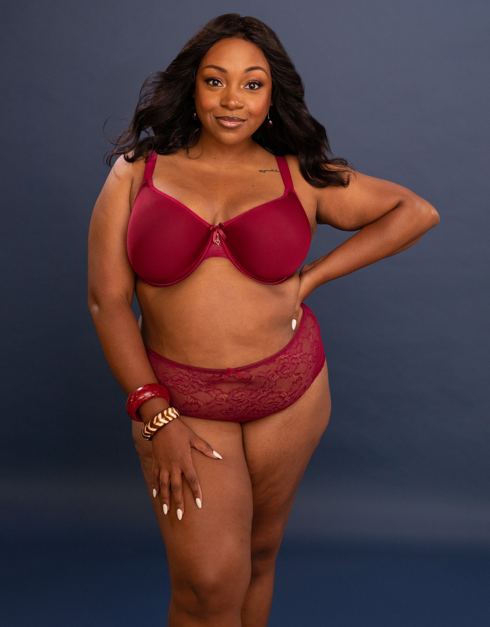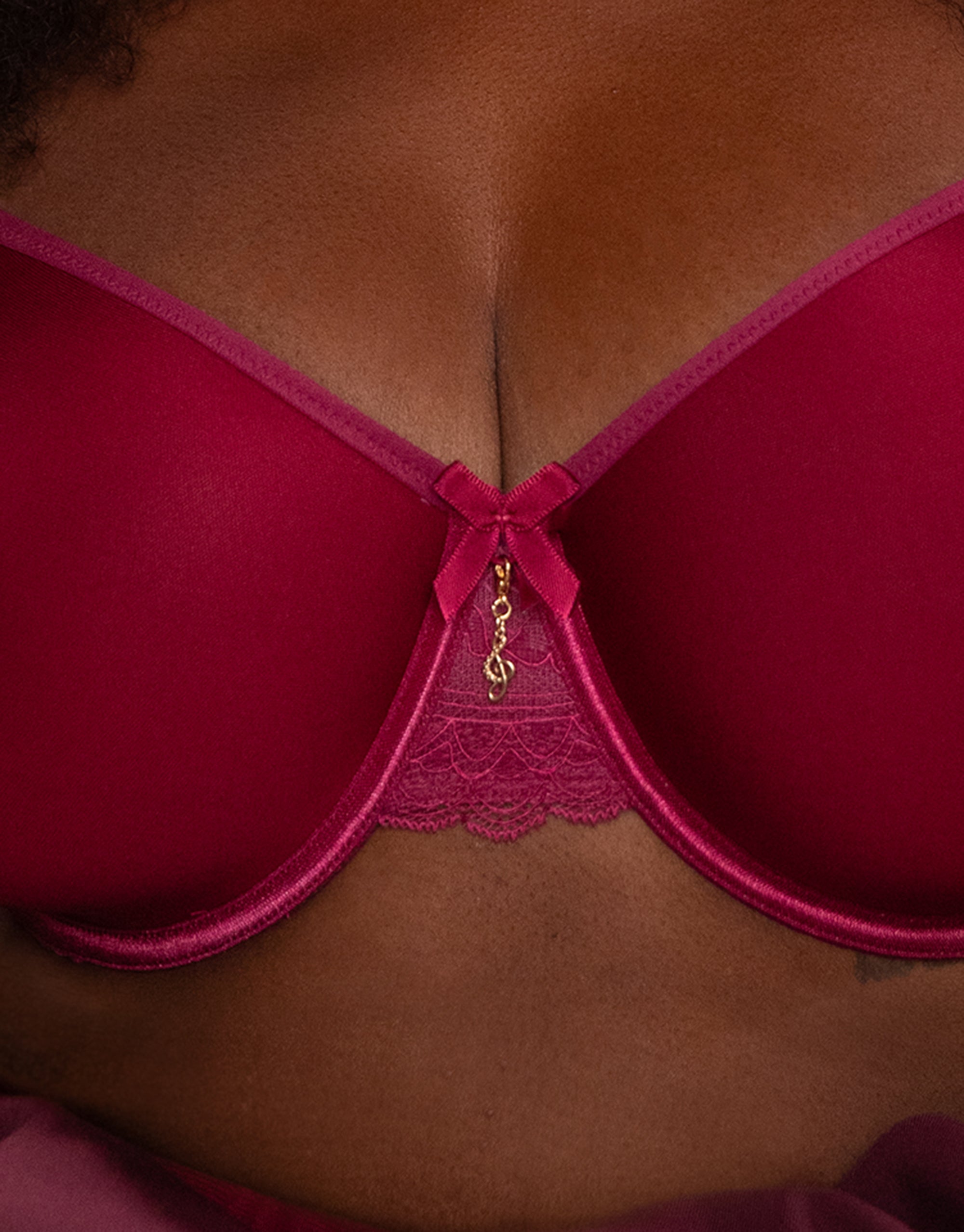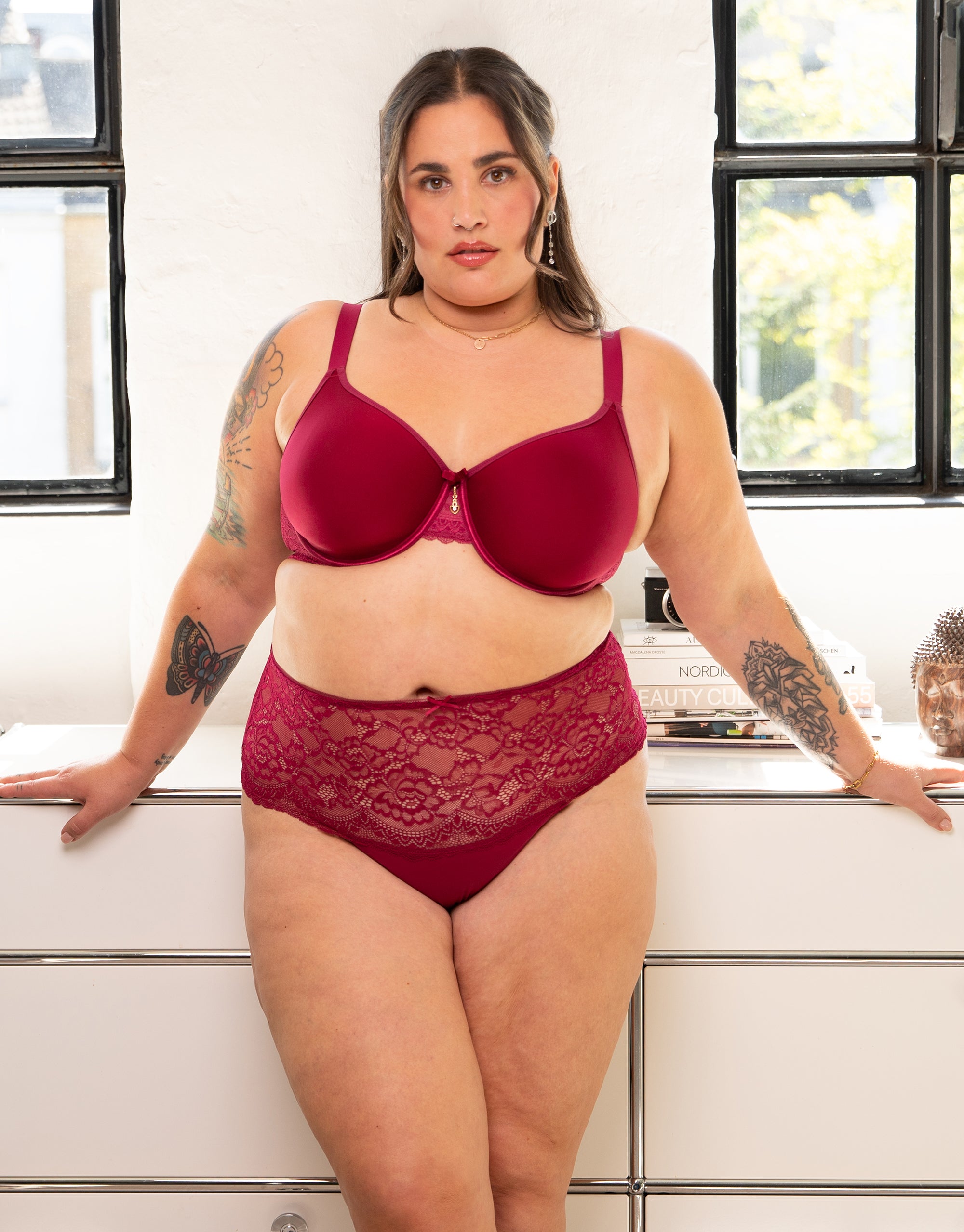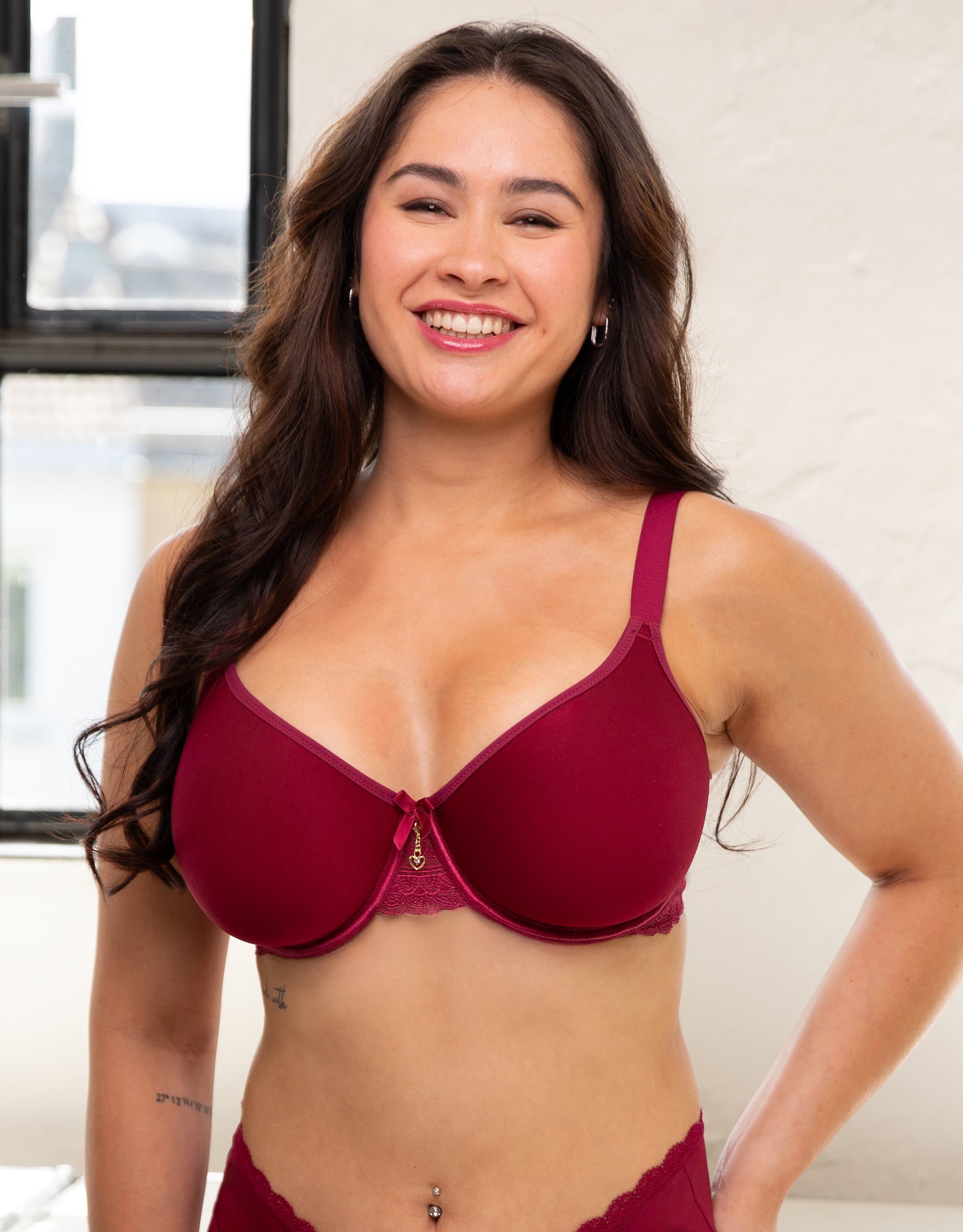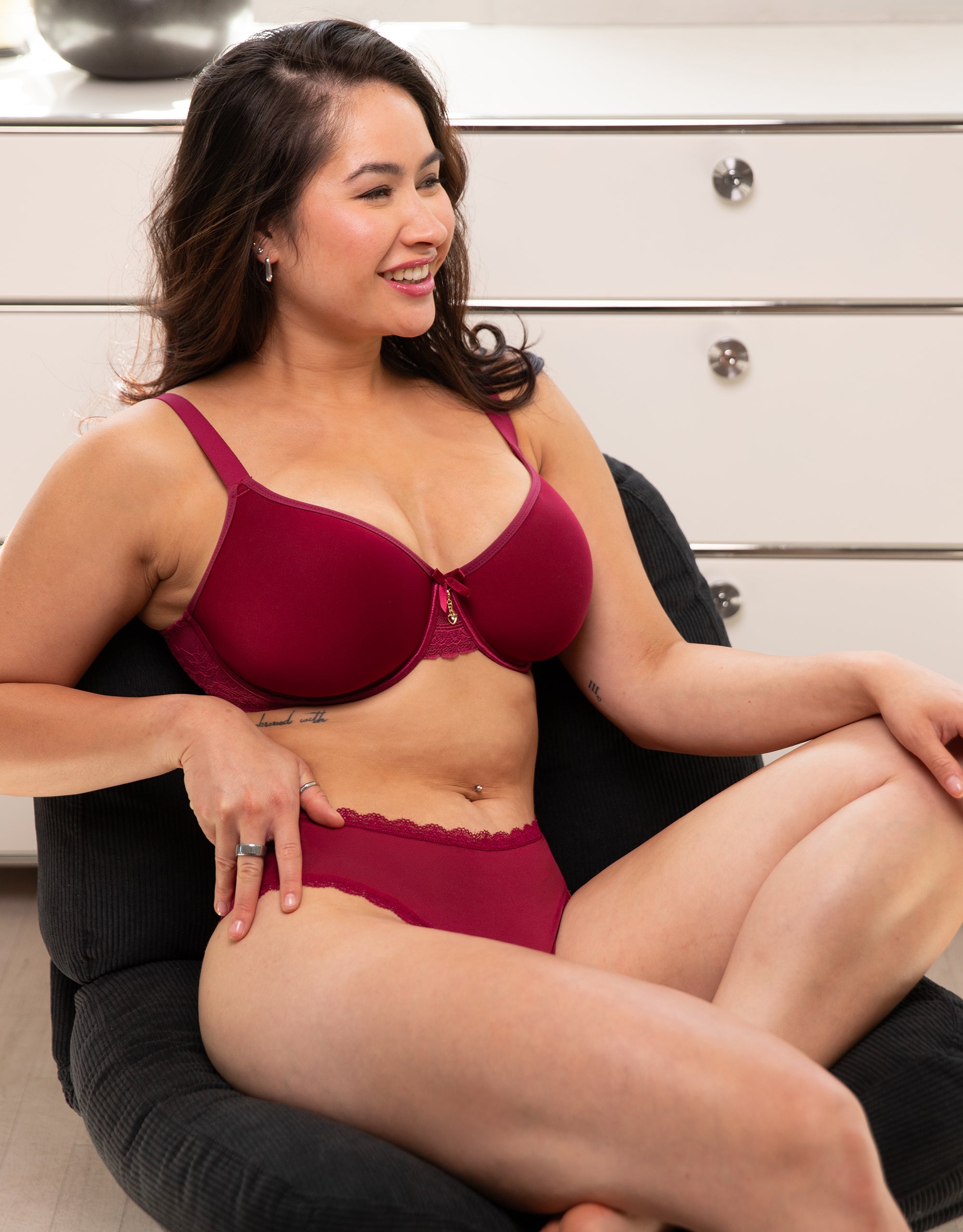 Mit diesem sinnlichen Bordeaux und mit zarter Spitze am Unterbrustband bringt "Lucy" nicht nur Komfort, sondern auch einen Hauch Eleganz in Deine Wäscheschublade.