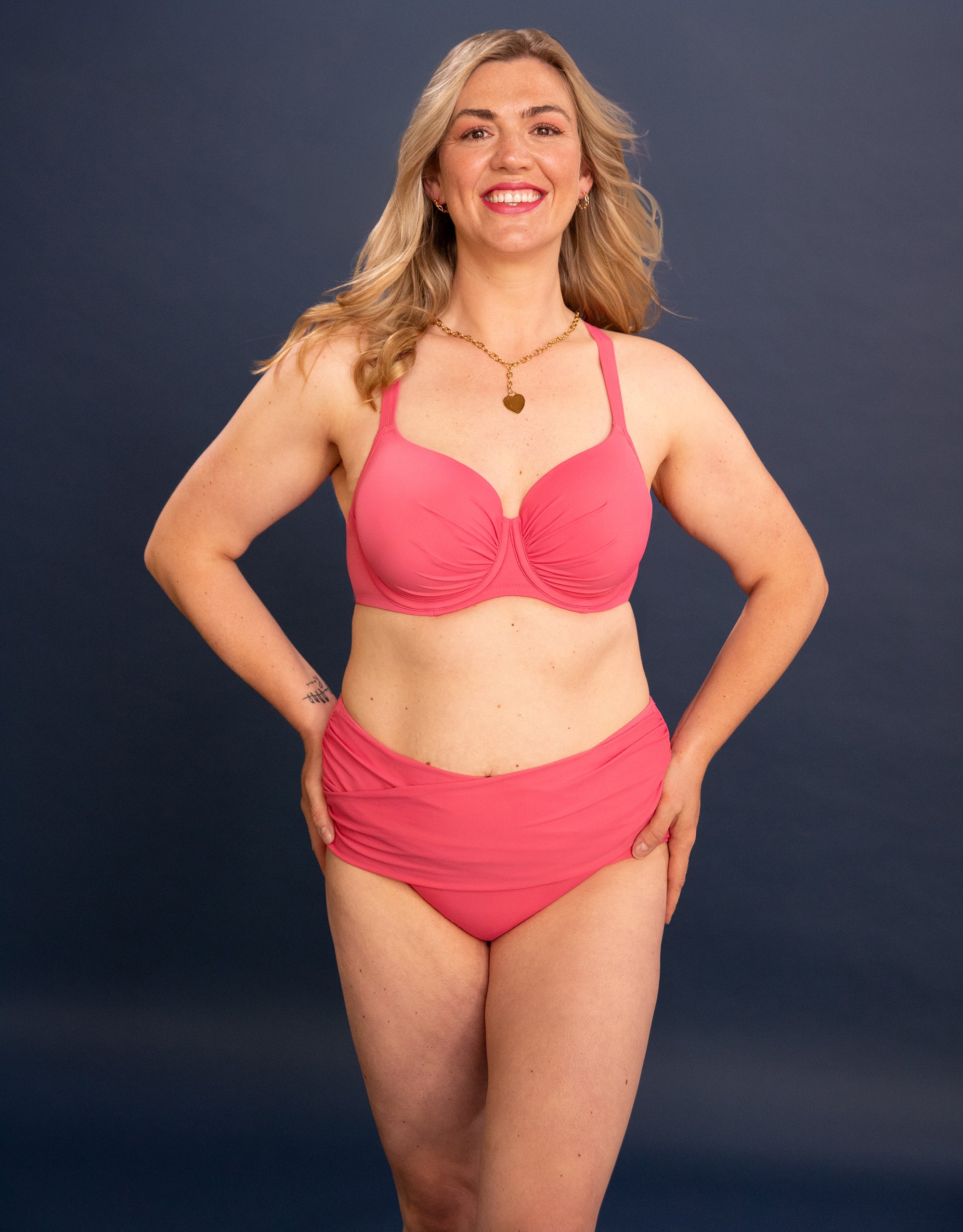 Unser "Valencia Chic" in flamingo ist ein Statement – mit cleanem Schnitt, goldenen Details und dem gewissen Glam-Faktor. Die überkreuzbaren Träger geben Dir Halt, wenn Du ihn brauchst und absolute Freiheit, wenn Du willst.