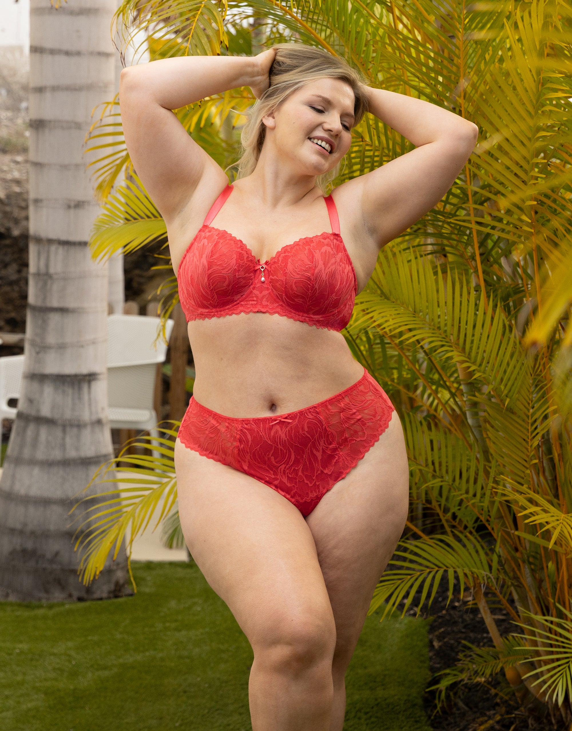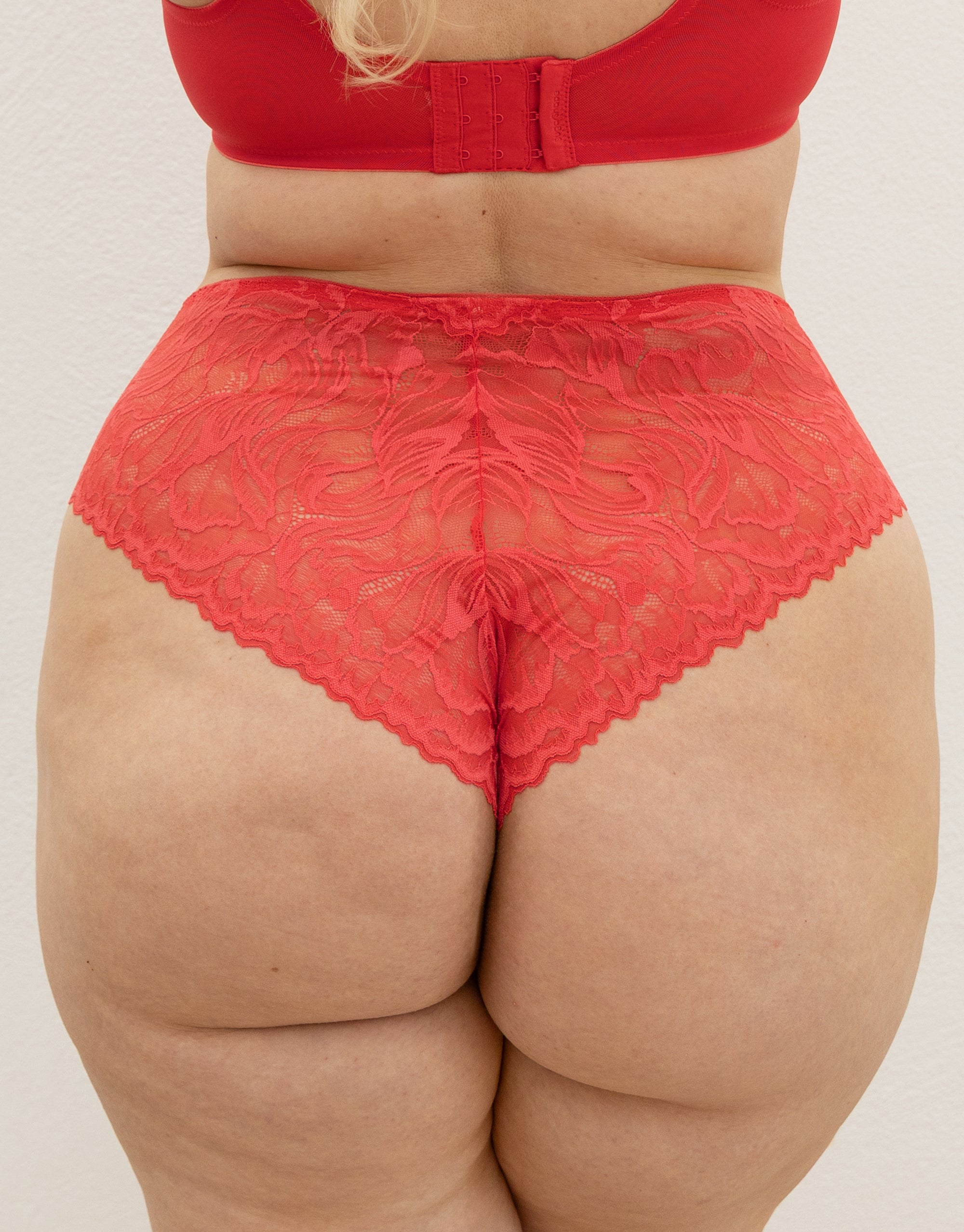 The semi-transparent lace is reminiscent of bright hibiscus flowers at sunset and shows off your silhouette in an exciting way. The high leg cut visually elongates your legs, while the fine lace gently hugs your curves. The cut at the back is in the typical skimpy Brazilian style – feminine, modern and confident. The front of the briefs is double-layered for comfort and a secure feel.