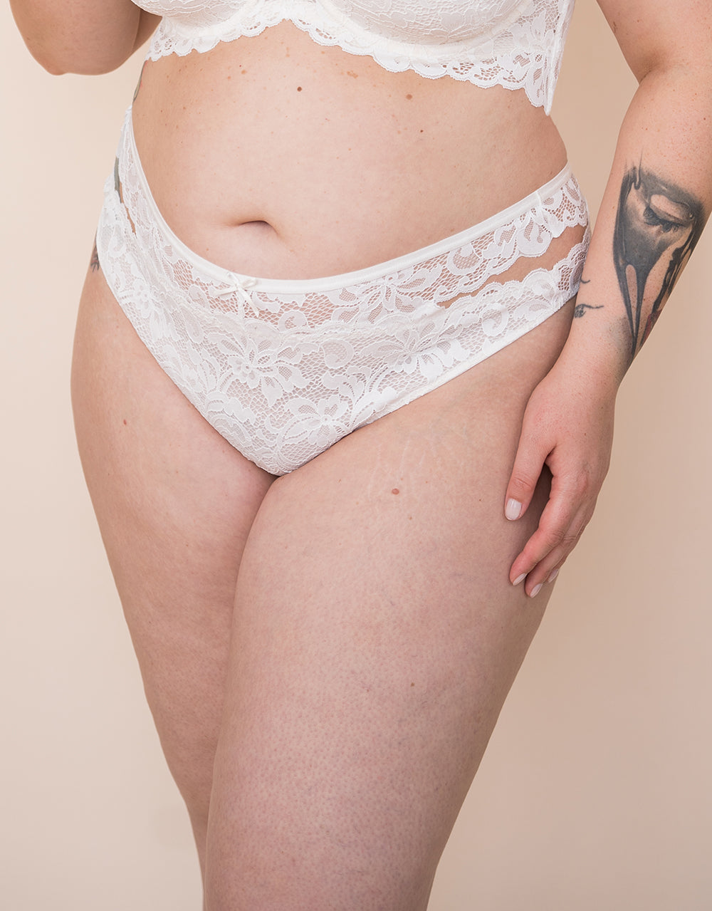 The thong is made of white lace with a floral look, which is lined with white fabric at the front. The single layer at the back allows your skin to shine through seductively.