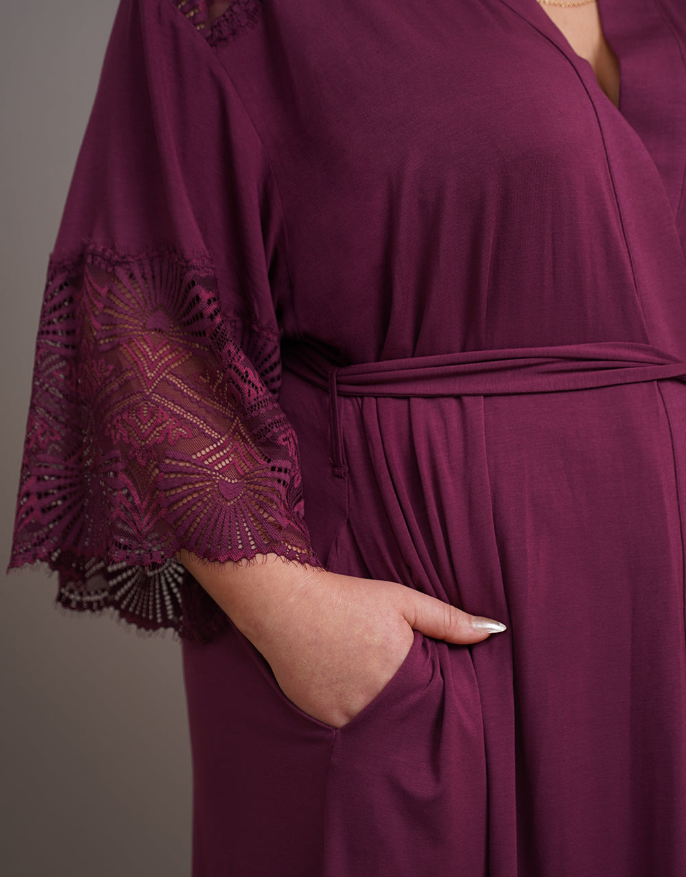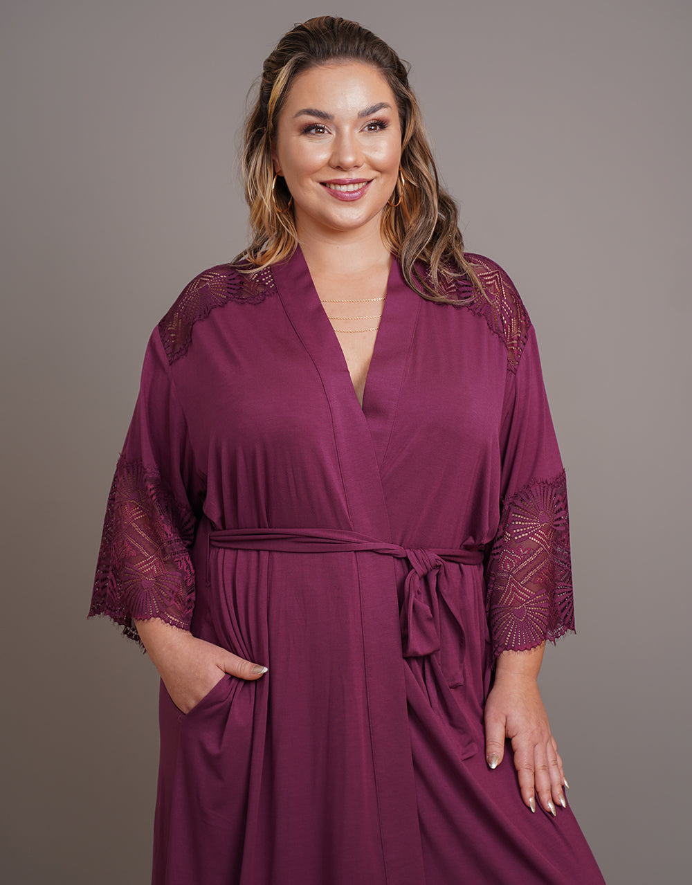 The lace of the kimono goes perfectly with the sexy Lilou collection or the Eliana maroon bralette.